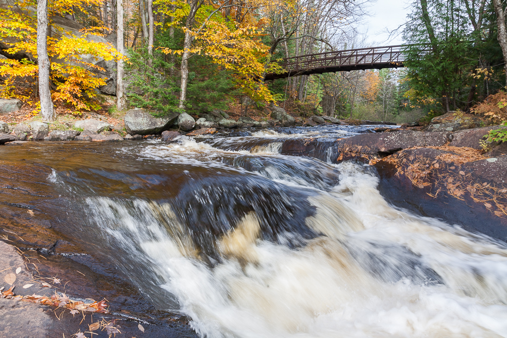 The trek to our first destination, Stubb’s Falls, was mostly uphill, ensuring that we stayed warm in the cool autumn air. We only crossed paths with a few other hikers, and felt pretty much alone once we left the main campground road to take the trail to the Falls. Our light hiking shoes were no match for the very wet conditions on the trail, and we had to resort to some rock hopping to avoid the puddles and mud along the way. We enjoyed having the Falls to ourselves, and took advantage of the solitude to take some self-portraits, as well as landscape shots.
