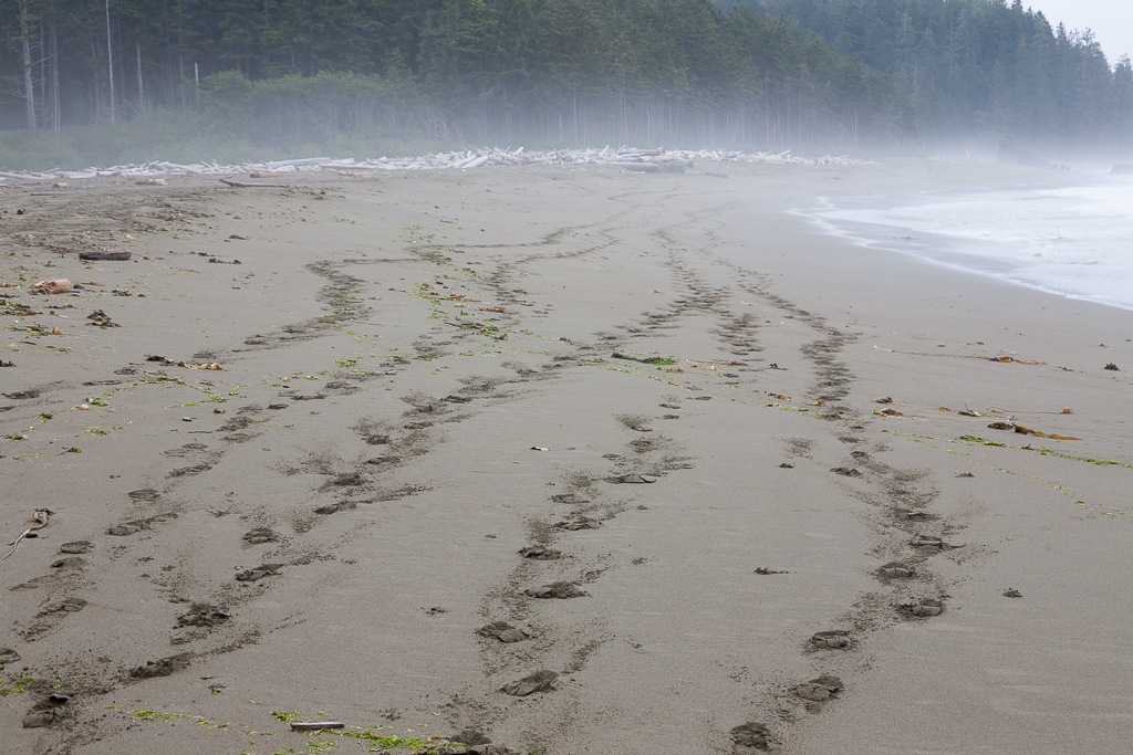 By contrast with the inland segments, beach segments offer an opportunity to feel the expanse of long, wide beaches, big skies, and an even bigger ocean to one side. While the time needed to complete segments of the inland trail depends on mud holes, roots and bridges, the time to complete segments of the beach routes depends entirely on the quality of the sand/pebbles underfoot. Another key distinction is the absence of kilometer markers on the beach – we came to appreciate these as important sources of feedback on our progress. Instead, the beach route forces you to hone and apply your map reading skills, and the use of points or bends in the beach to relate your position to the map.